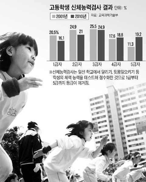고등학생들 사정도 다르지 않다. 교과부가 매년 실시하는 전국 일선 고교의 체력 우수자(1등급) 비율은 지난 2001년 20.5%에서 작년 16.1%로 감소했고, 체력이 가장 낮은 5급자 비율은 11.3%에서 19.2%로 증가했다.