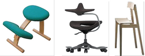 어떻게 앉는 것인지 알 수 있나요? 왜 이런 모양으로 만들었을까요? 맨 왼쪽 의자는 등받이나 팔걸이가 없고 대신 무릎 받침대가 있습니다. 등받이가 없는 이 의자에 앉으면, 등을 꼿꼿이 세우게 된다고 해요. 가운데는 어떤 병원에서 만든 의자인데 등받이 대신에 '가슴받이'가 달려 있습니다. 이렇게 앞으로 기대면 허리를 자연스레 펼 수 있게 된다고 합니다. 오른쪽은 2011 아사히카와 국제가구 디자인 공모전에서 최고상인 '금잎상'을 받은 '반쪽 의자'입니다. 엉덩이를 걸치는 바닥의 크기를 절반으로 줄인 불편한 의자인데, 이 의자 역시 등을 꼿꼿이 세우게 한다고 합니다.