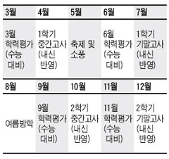 고등학교 1학년 연간 학사 일정은 학교마다 조금씩 다르지만 보통 다음과 같다.