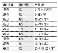 대학수학능력시험에서 총점 대신 백분위에 따라 수험생의 등급을 정하는 제도로, 2002학년도 수능시험부터 도입되었다. 등급제는 수능 총점 소수점 이하 몇 자리에서 당락이 좌우돼온 기존의 수능 의존도를 줄이고 수능을 자격기준으로만 활용하게 하려고 도입되었다. 또한, 내신에서는 학교별로 시험문제를 쉽게 내 만점학생들이 많이 나오게 되면 만점 받은 학생이 모두 대입에서 100점을 받을 수 있었지만, 등급제가 적용되면 만점자가 전체 학생의 4%를 넘으면(100명의 전교 학생 중에 만점이 10명일 경우는 전체의 10% 이기 때문에) 만점자라고 하더라도 1등급이 아닌 2등급을 모두 받게 되어 시험문제를 학교마다 쉽게 출제하려는 부분을 막을 수 있기 때문에 활용되고 있다. 9등급제는 전체 수능 응시학생을 최상위 점수에서 최하위까지 9등급으로 나누고 학생이 속해있는 해당 등급을 표시한 것이다.