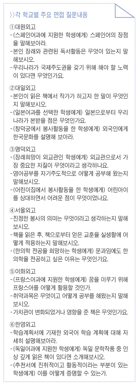 ◆면접은 경기권 외고와 마찬가지로 주로 제출 서류 내용을 확인하는 질문으로 진행
