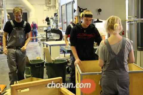 - ▲ 옴니아 직업학교 목공과 학생들이 실습에 열중하고 있다. 이들은 유명 디자이너와 함께 가구를 제작해 다음달 서울 코엑스에서 열리는 서울디자인페스티벌에 출품할 정도로‘프로급 실력’을 자랑한다. /오현석 기자 socia@chosun.com
