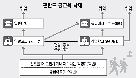 핀란드에서 중·고교를 나와 헬싱키 공대에 재학 중인 교민 송한(23)씨는 "직업학교를 졸업하고 바로 취직해도 대졸자보다 월급이 적지 않고 어떤 경우엔 더 많다"며 "일찍 부모로부터 독립하고 싶어하는 아이들은 직업학교를 선호한다"고 말했다.