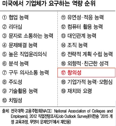 예컨대 미국에서 ‘기업체가 직원한테 요구하는 역량’ 19가지 가운데 창의성의 우선순위가 17위로 꼴찌 수준인 건 이런 이유 탓이다. 창의력이 아닌 협업능력, 리더십, 문자로 소통하는 능력, 문제해결능력, 높은 직업윤리의식 등이 미국 기업이 중시하는 상위 5개 항목이다. ‘교육 선진국’으로 불리는 핀란드가 최근 개정한 교육과정에 도입한 7가지 핵심 역량에도 창의력은 들어 있지 않다.