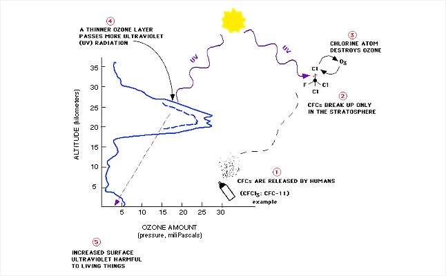 대류권으로 확산하여 결국 성층권까지 이르게 된다. 성층권의 강한 자외선에 의해 이들 물질에 광화학 분해반응이 일어나 염소원자나 브롬원자가