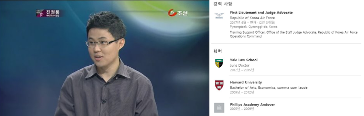 2012년 tv조선에 출연한 진권용 변호사, linkedin에 나와있는 진 변호사의 경력.