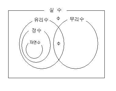자연수, 정수, 유리수, 무리수, 실수의 포함관계를 벤다이어그램으로 나타내면 다음과 같다.
