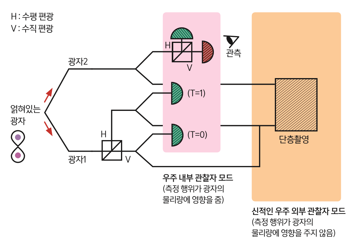 이와 동시에 절대자와 같은 우주 바깥의 독립적인 시계로 시스템 전체의 양자 상태를 측정했다(그림의 주황색 박스). 이 관찰자는 광자에 영향을