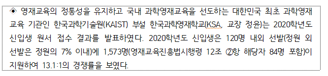 한편, 한국과학영재학교의 정원 외 선발은 정원의 7% 이내로 선발될 예정이다. 한국과학영재학교는 5월 8일(수) 학교 홈페이지를 통해 2단계 평가 대상자를 공개한다. 2단계 평가일은 5월 19일(일)이다.