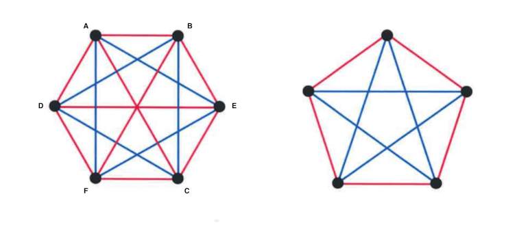 For example, let’s call the points A, B, C, D, E, F and select one of them, say A. Of the five lines drawn from A to the other five points, there must be three lines of the same color.